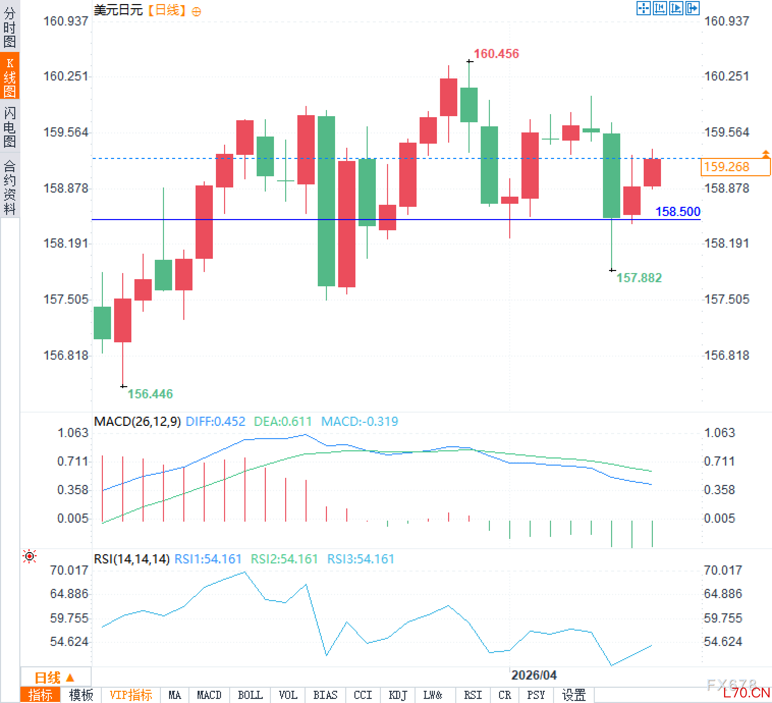 技术面上,美元兑日元汇率目前稳定在159一线附近,短期呈现温和反弹迹象。价格已从158.20附近支撑位回升,移动平均线系统显示多头信号占优,但相对强弱指数处于中性区间,表明动能尚未完全恢复。若能源价格稳定回落,汇率可能测试158.50下方支撑;反之,若油价重拾升势,汇率将面临160上方阻力考验。