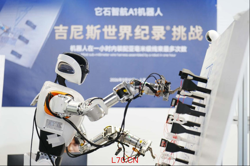 机器人落地的场景,除了家庭之外,工业场景也是一大方向。AWE现场,它石智航刷新了一项吉尼斯世界纪录:在一小时内完成亚毫米级线束装配最多次数。记者目睹了整个挑战过程,在1:1复刻的真实工业场景中,A1机器人连续作业60分钟,重复完成柔性线束插拔装配任务达105次,这是对具身智能真实作业能力的极限证明。