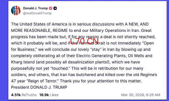 1、特朗普在周一的Truth Social帖子中威胁称,如果没有达成结束战争的协议,他将“摧毁”伊朗的能源和水利基础设施。他表示,“如果霍尔木兹海峡不立即‘重新开放’,我们将通过攻击这些设施来结束我们在伊朗的‘美好停留’。”