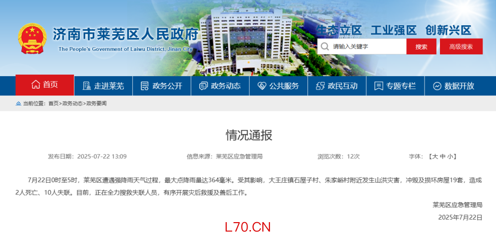 山东济南莱芜区强降雨致2人死亡10人失联